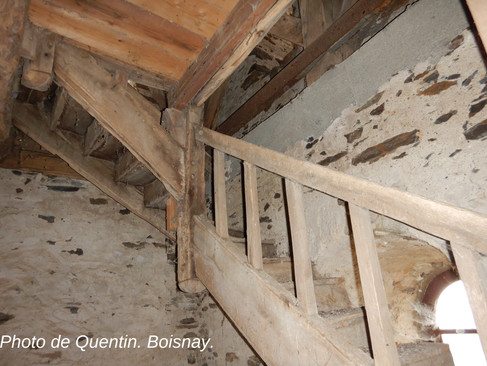 Pour commencer notre ascension vers le beffroi, il nous faut entrer par la porte du coté Nord de l'église au pied du clocher, tout de suite après à droite une deuxième porte nous mène à la base du clocher, la montée commence par un escalier en bois installé sur les murs de la tour, pour accéder au premier étage où l'on découvre l'ancienne horloge mécanique logeant dans un placard. Ce beau mécanisme provient des ateliers de chez GOURDIN à Mayet dans la Sarthe.